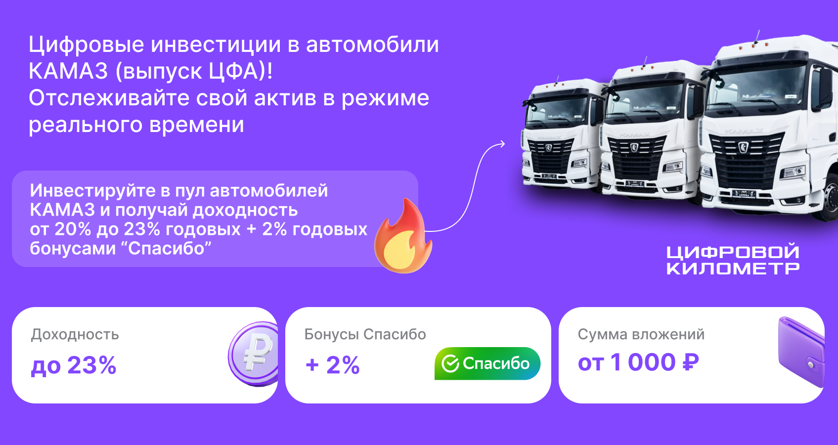 В мобильном приложении «Цифровой километр» (дочерней организации «КАМАЗа») частные инвесторы смогут приобрести цифровые финансовые активы (ЦФА). В результате инвестор будет получать фиксированный доход от 20% до 23% годовых раз в квартал. Ещё 2% годовых в рамках программы будут дополнительно начислены бонусами Спасибо, если автомобиль проедет больше определённого километража. Минимальный размер вложения – 1000 рублей.