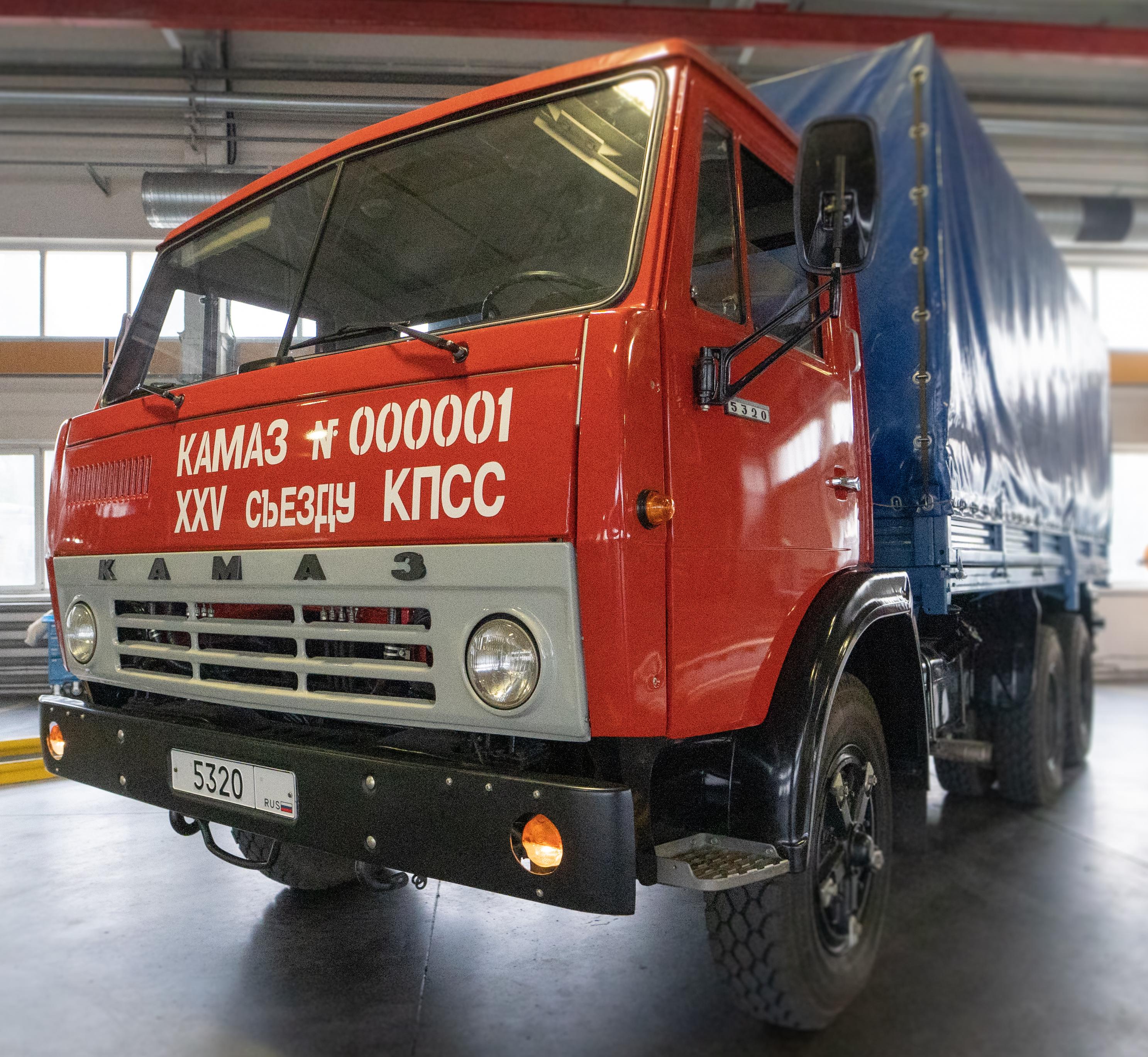 Строительство завода в Набережных Челнах началось 13 декабря 1969 года, а уже 16 февраля 1976 года с главного сборочного конвейера сошёл первый автомобиль – бортовой КАМАЗ-5320. В составе почётного экипажа грузовика с заводским номером 0000001 были водитель-испытатель Валерий Перетолчин, монтажник Дмитрий Загребельный, работник «КАМГЭСЭНЕРГОСТРОЯ» Рафис Сабирзянов. Первенец «КАМАЗа» был представлен на Красной площади в Москве, где проходил XXV съезд КПСС. Грузовик прибыл туда своим ходом и стал символом успешного выполнения планов партии. Впоследствии этот экземпляр проработал несколько лет в Башкирии, а затем был выкуплен «КАМАЗом» и восстановлен. Сейчас КАМАЗ-5320 с заводским номером 0000001 является одним из самых ценных для «КАМАЗа» экспонатов.
