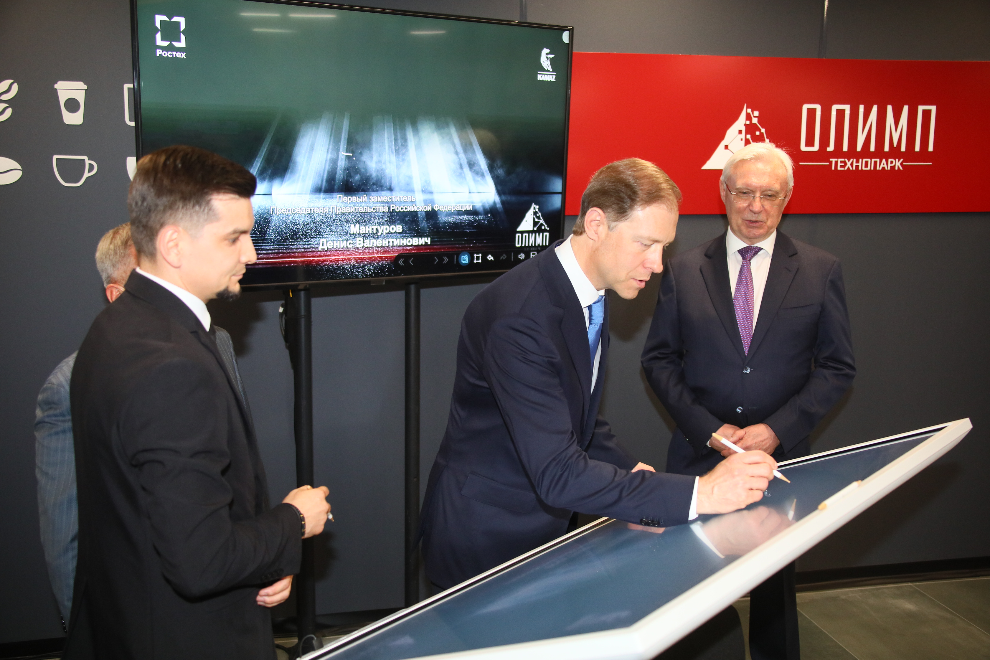По окончании презентации состоялась экскурсия по лабораториям Центра электроники и элементов питания ПАО «КАМАЗ». В завершение маршрута Денис Мантуров и Рустам Минниханов оставили подписи в электронной книге почётных гостей технопарка «Олимп» и отметили важность нового технопарка для дальнейшего развития России.