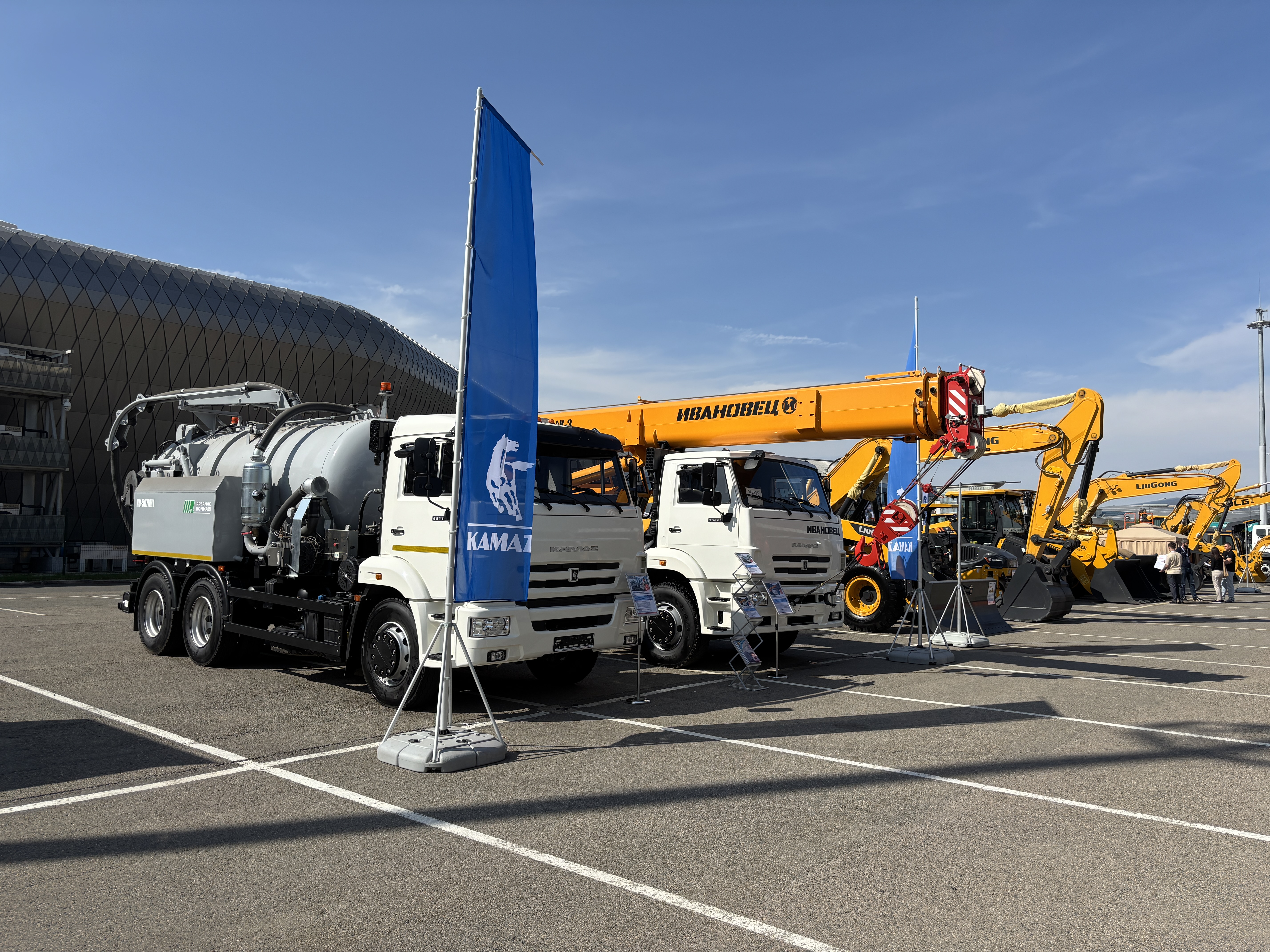 Участие в крупнейшей выставке строительной и горнодобывающей техники в Центральной Азии приняли официальные дилеры «КАМАЗа» в Казахстане – ТОО «Акмолинский автоцентр» и ТОО «ЗапКаз-Авто». Вниманию посетителей площадки мирового уровня, где ведущие отраслевые компании продемонстрировали свою продукцию, были представлены автокран Ивановец КС-35714К на шасси КАМАЗ-53605 и илососная машина КО-507АМ1 на шасси КАМАЗ-65115.