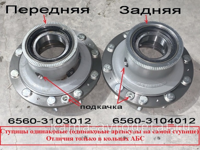 Ступица переднего колеса 6560-3103012 автомобиля КамАЗ с системой подкачки колес отличается от ступицы заднего колеса 6560-3104012 кольцами (ротором) датчика АБС. Заводской артикул на обоих ступицах (отлитый на заводе) одинаковый 6560-3103015.