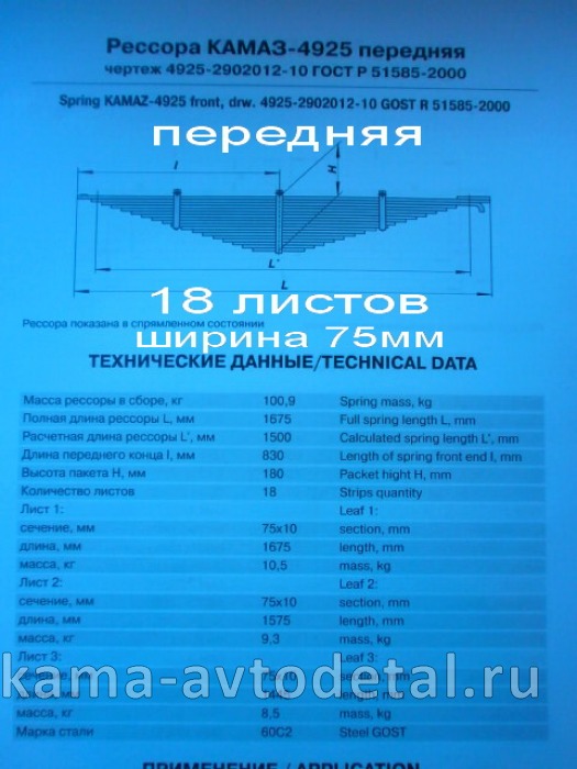 рессора передняя 4925-2902012-10 (18 листов, ширина 75мм) УСИЛЕННАЯ
